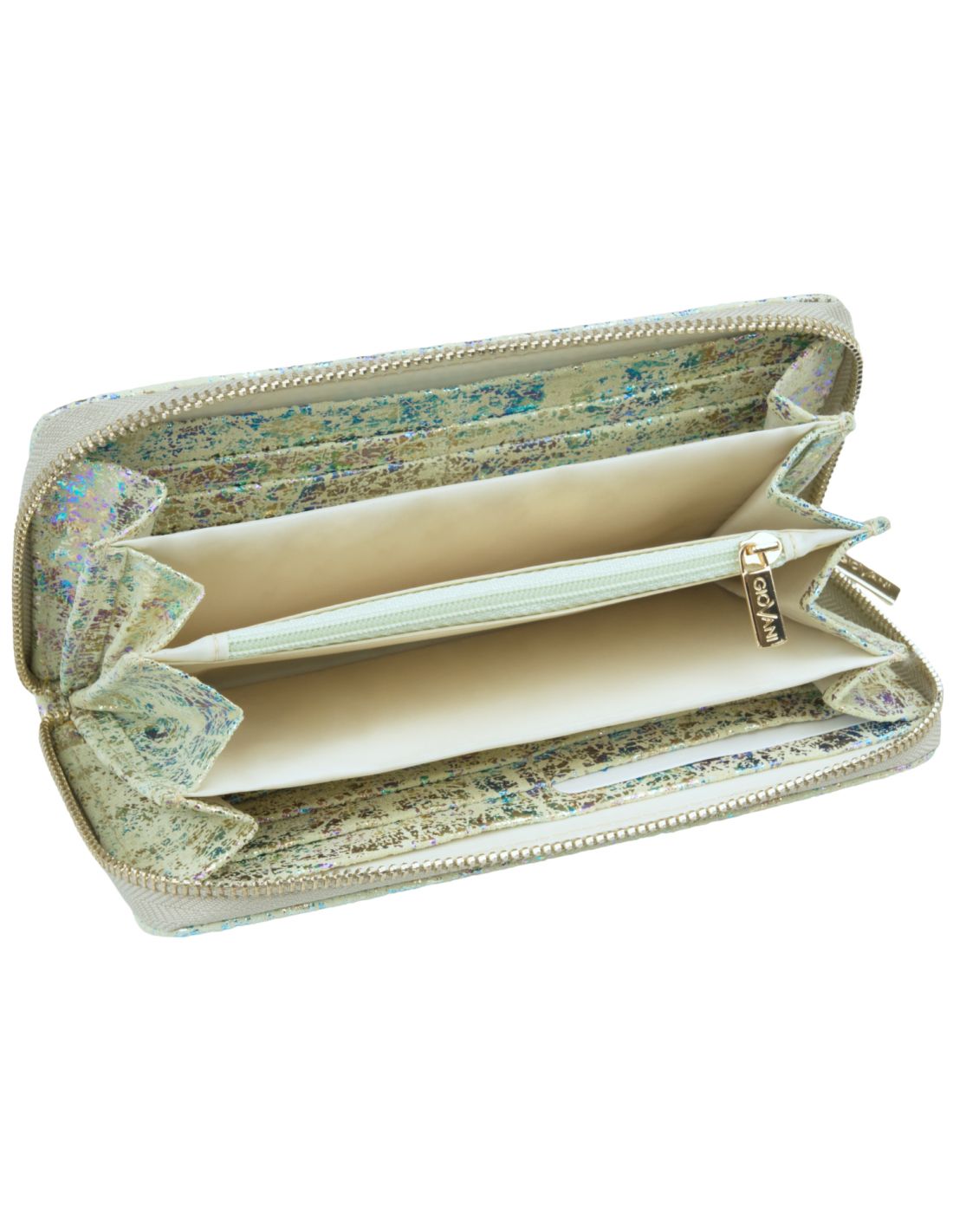 Duży damski portfel z naturalnej skóry powlekanej. Dzięki zastosowaniu holograficznego wzoru na skórze portfel mieni się na wiele barw. Jest on świetnym dodatkiem do awangardowego stylu jak i dla osób lubiących wyróżniać się w tłumie. Portfel zamykany jest na zamek błyskawiczny, a w jego wnętrzu znajdziemy: cztery przegrody na banknoty, dwanaście miejsc na karty oraz przegrodę zapinana na zamek błyskawiczny. Portfel jest w stanie pomieścić dowód rejestracyjny. Na jego froncie znajduje się logo marki Giovani.