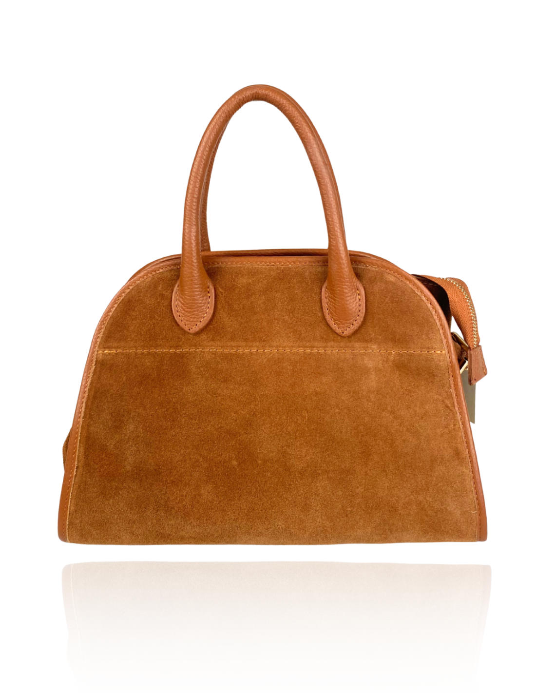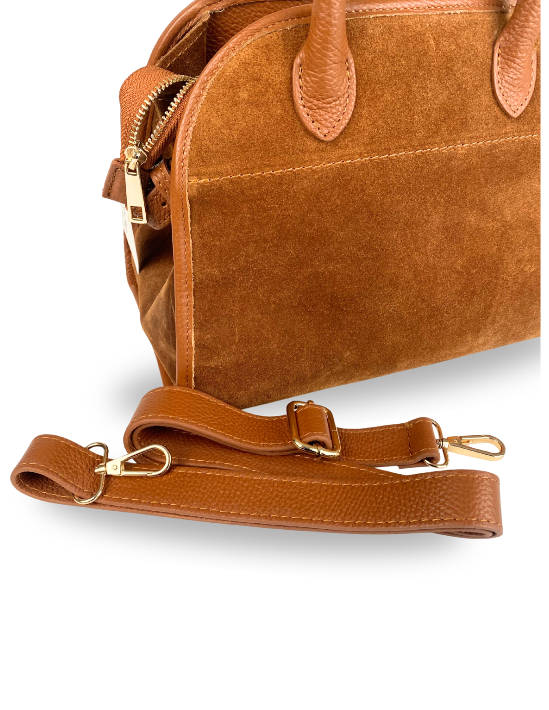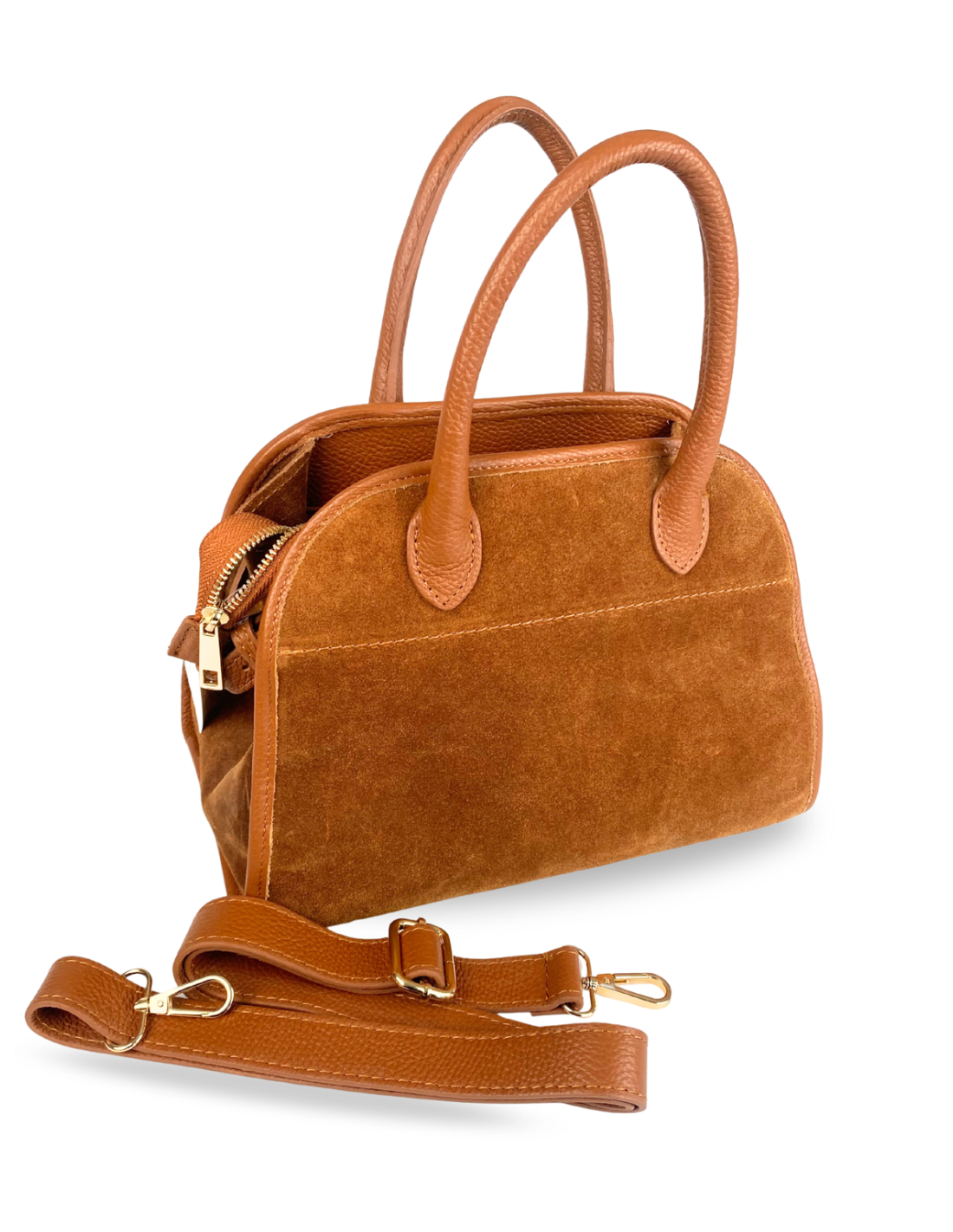 Elegancka i pojemna torebka wykonana z wysokiej jakości zamszu w kolorze koniakowym
