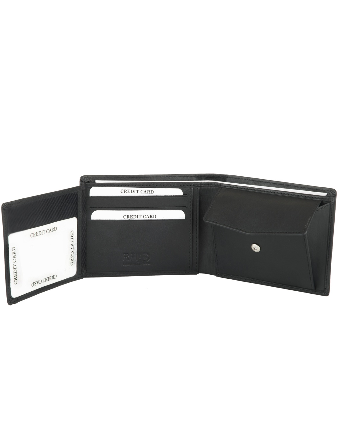 Wewnątrz portfela znajduje się kieszonka na monety zapinana na zatrzask, 6 miejsc na karty oraz jedno okienko ID. W portfelu znajdziemy także 2 przegrody na banknoty, które można wkładać w całości, bez konieczności składania oraz 3 dodatkowe, płaskie kieszonki.