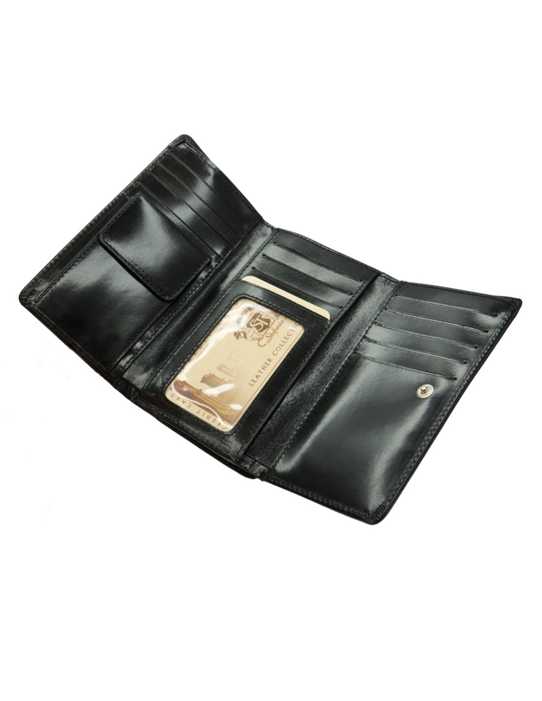 W środku portfel posiada przegrodę na banknoty, która wewnątrz posiada dodatkowo dużą kieszonkę na zamek. Trzy kieszenie, małą pionową kieszonkę na zatrzask, dwanaście miejsc na karty oraz jedno okno ID. Kieszonka na monety zamykana na zamek błyskawiczny.