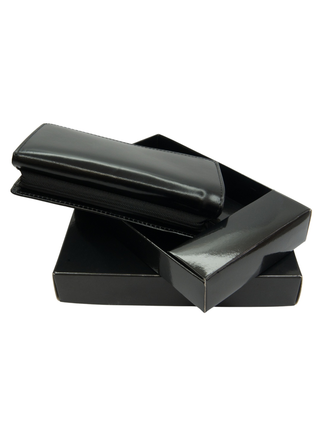 Portfel zapakowany w elegancki, lakierowany kartonik.