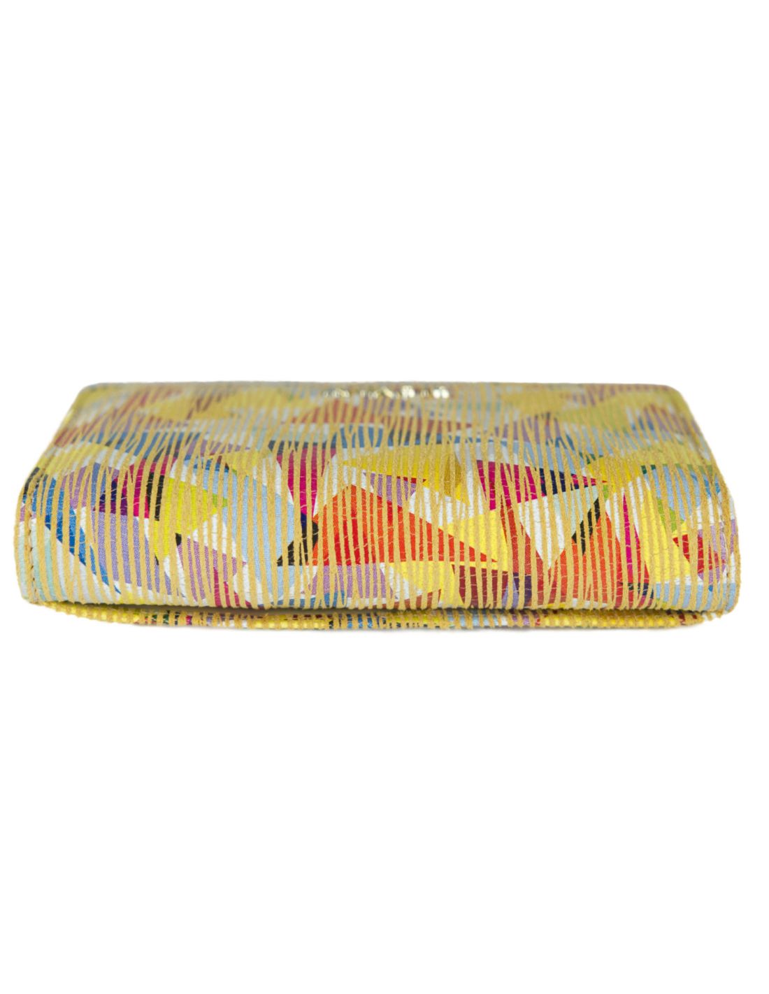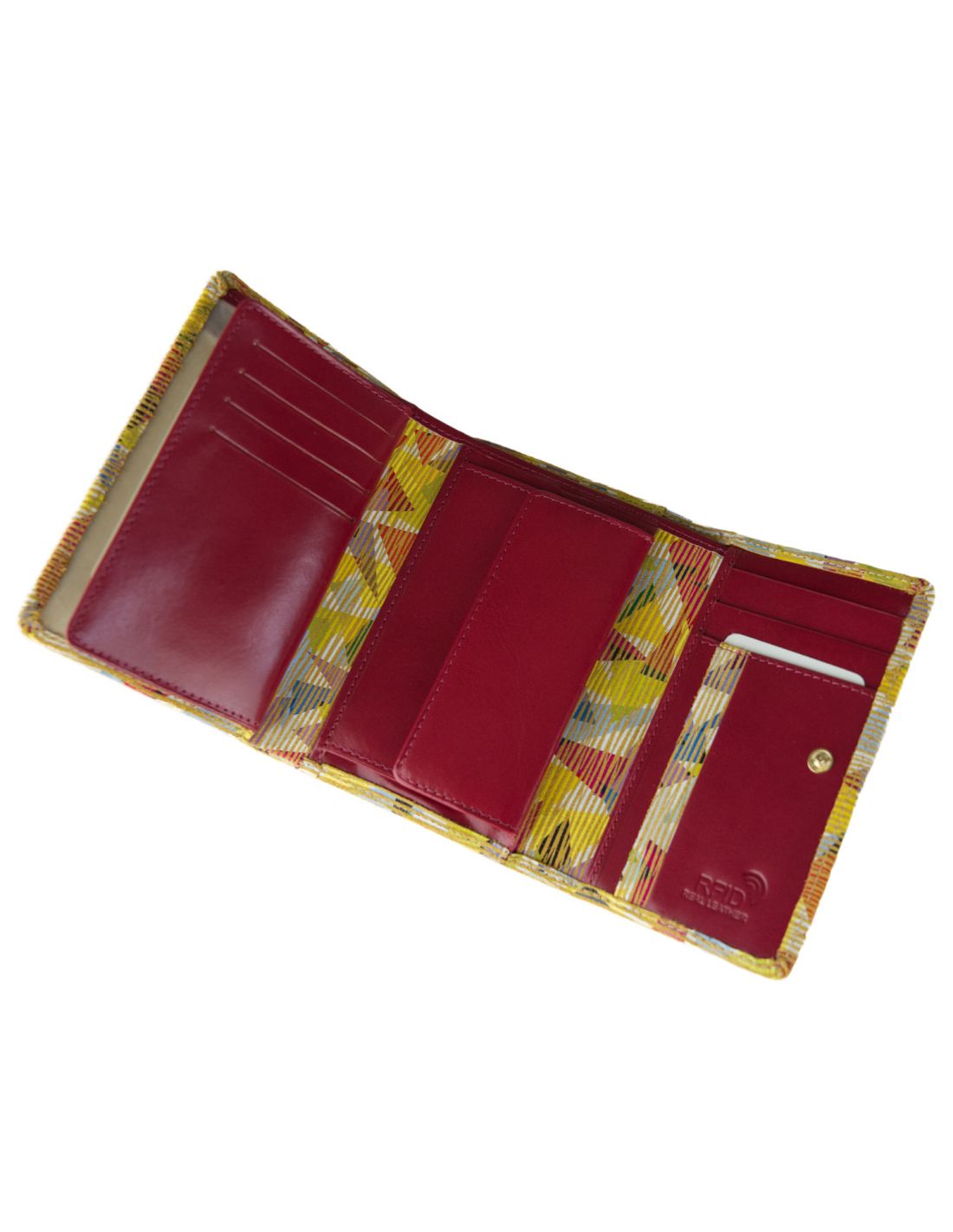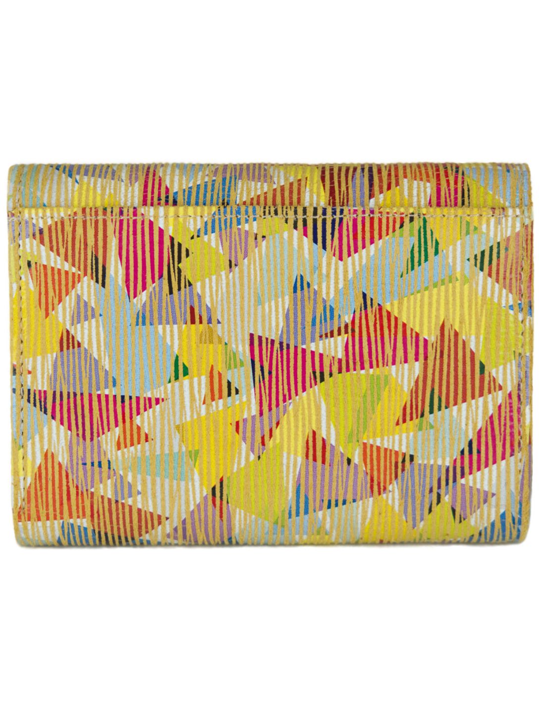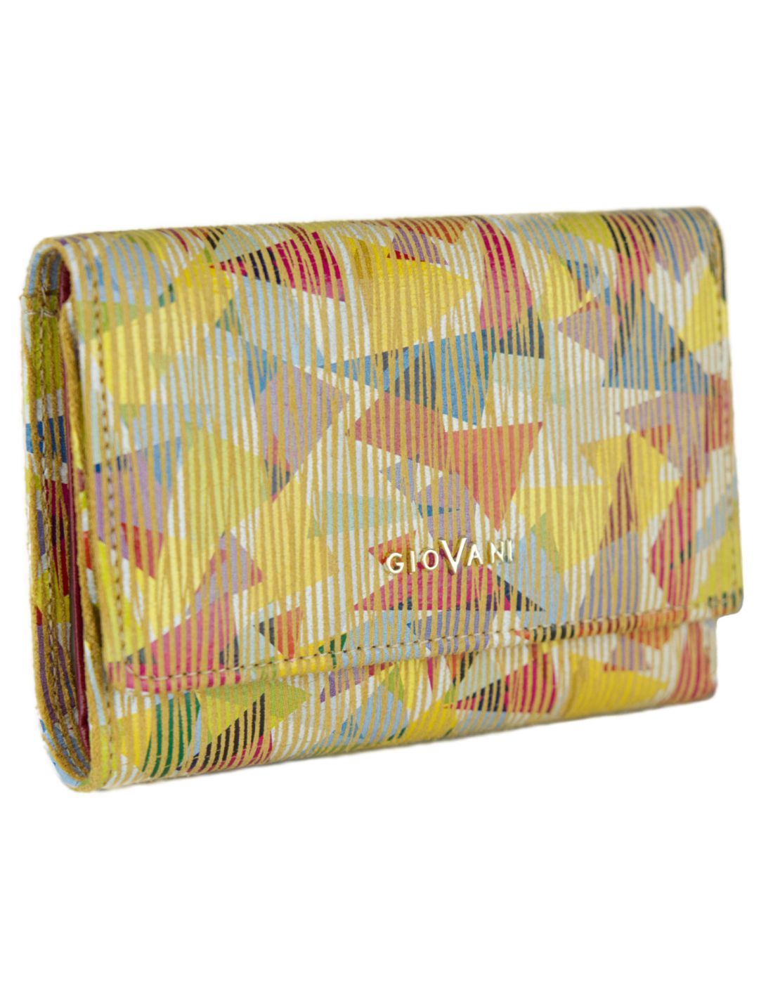 Portfel wykonany jest z wysokiej jakości skóry naturalnej, na której nadrukowano piękny print różnokolorowych trójkątów. W zewnętrznej stronie portfela kolorem przewodnim jest barwa żółta. Środek portfela to połączenie printu z wierzchniej strony, z klasyczną skórą naturalną w kolorze czerwonym. Całość współgra ze sobą. Portfel jest jasny, słoneczny i wyjątkowy. Dzięki nadrukowi na skórze portfel jest odporniejszy na uszkodzenia mechaniczne, takie jak zarysowania. Delikatne, złote detale tj. logo firmy GioVani są dodatkową ozdobą portfela. Portfel Susan ma delikatnie błyszczące wykończenie, jest miły w dotyku i wygodny w użytkowaniu.