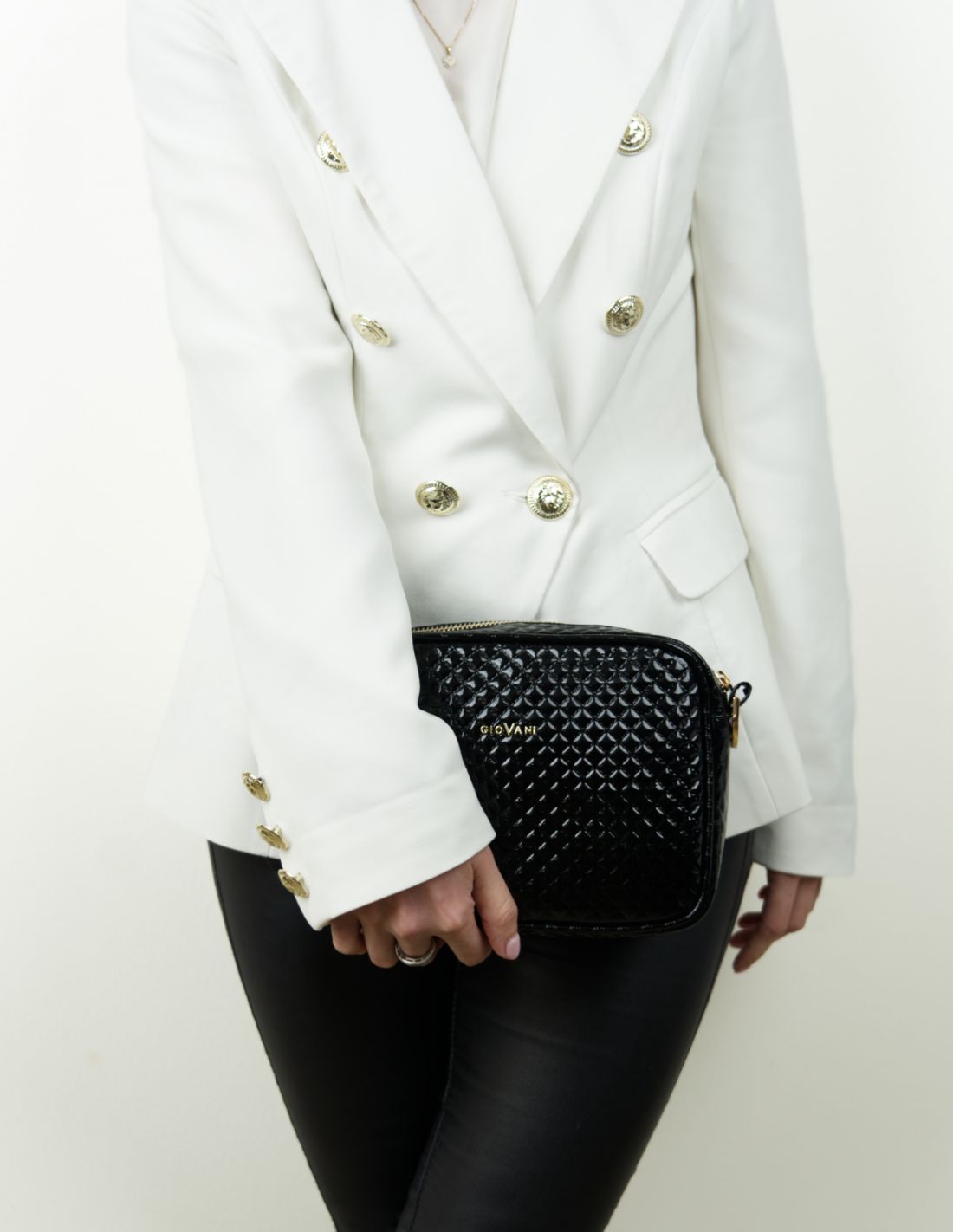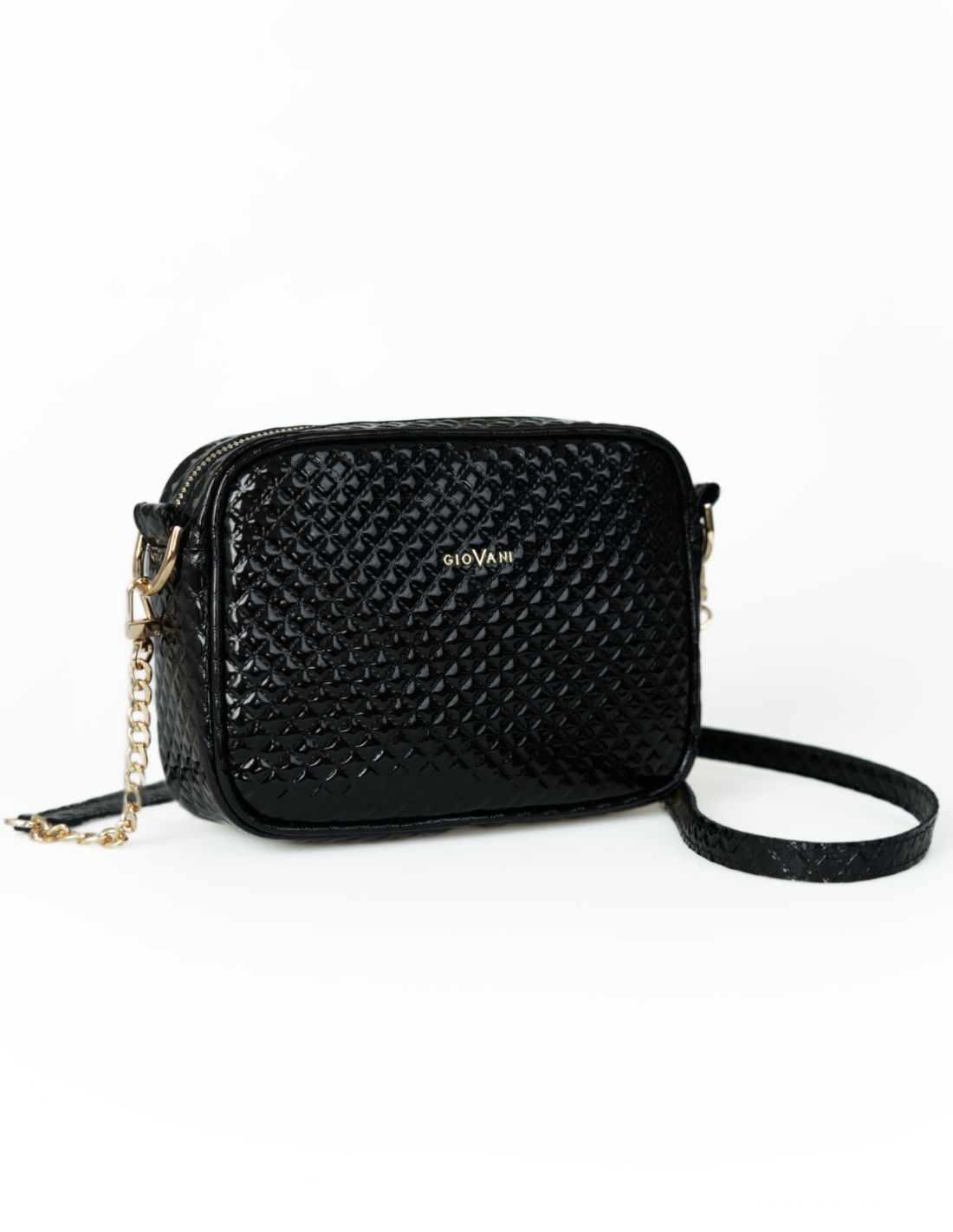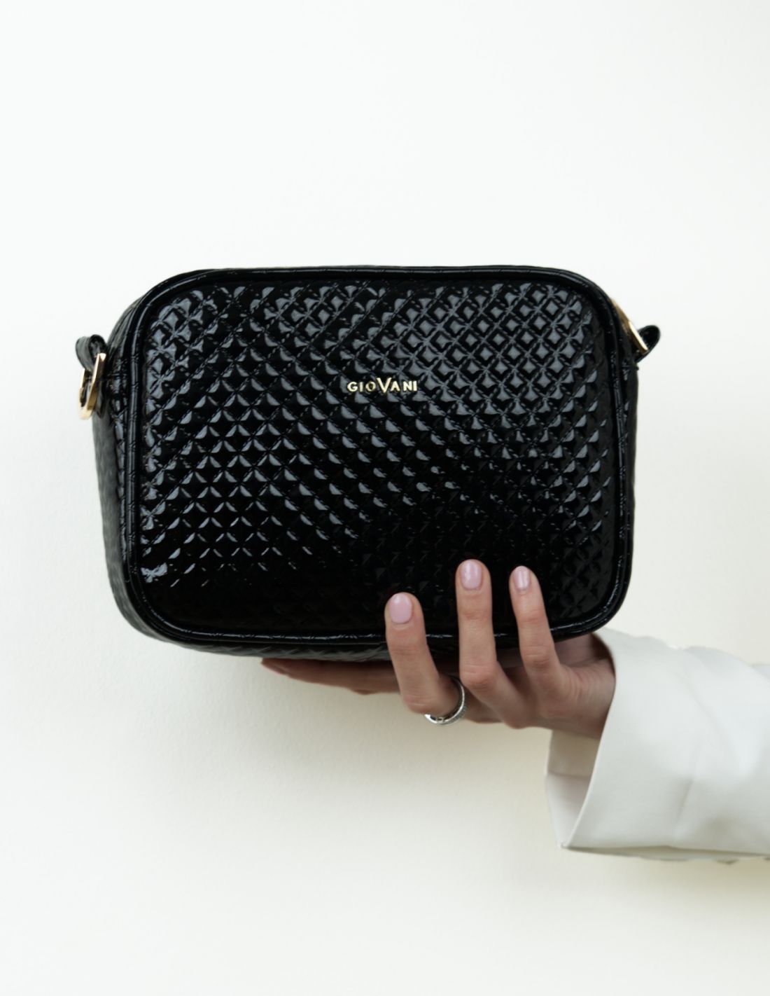 Torebka posiada złote okucia, które dodają jej elegancji. Dodatkowo na przodzie torebki znajduje się logo marki GioVani. Logowanie znaleźć można także na uchwytach zamka błyskawicznego.
