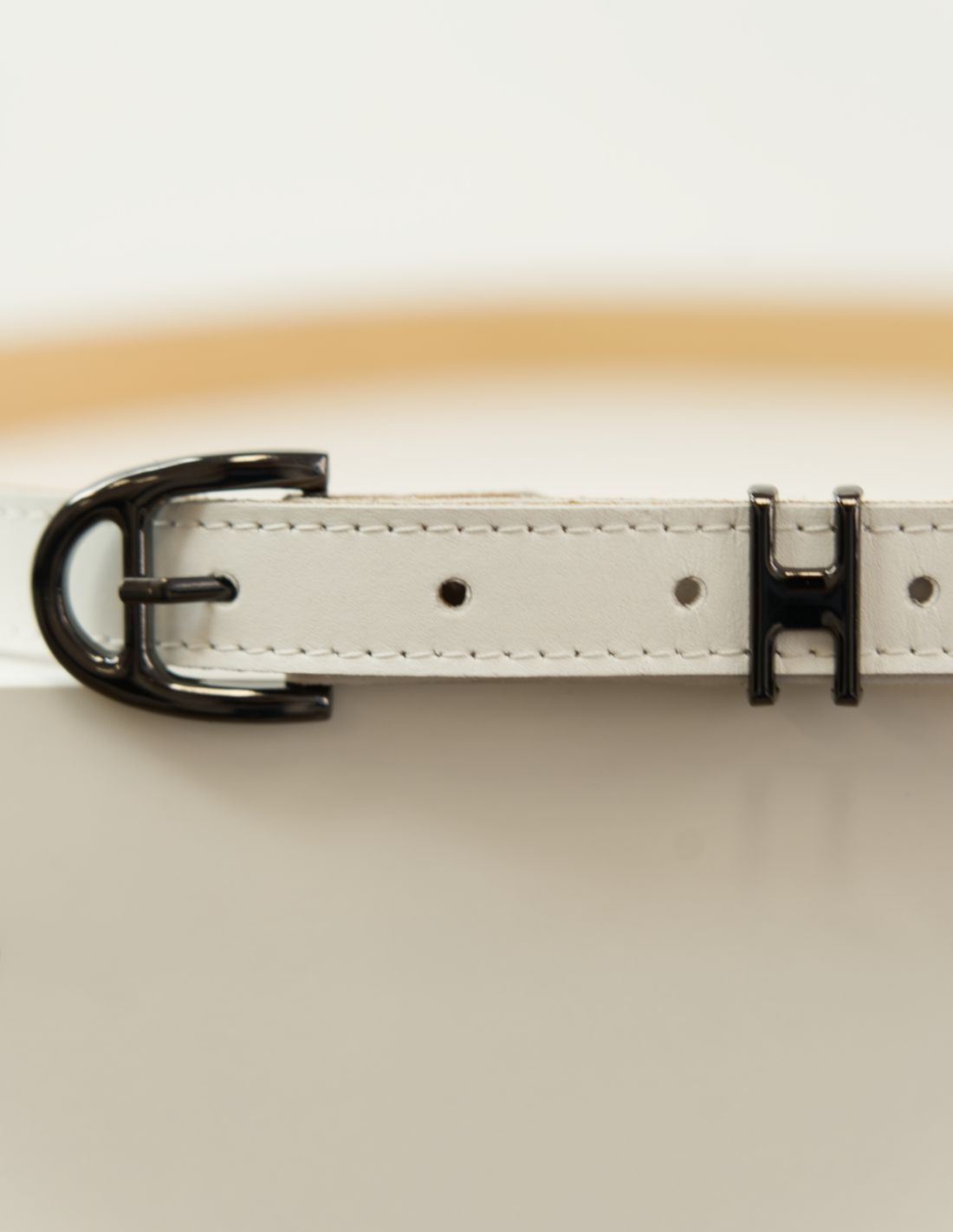 Ta metalowa szlufka w kształcie litery H dopełnia estetykę paska, dzięki niej nabiera on eleganckiego charakteru, który w sposób subtelny, lecz efektowny, przyciąga uwagę i dodaje blasku. Delikatna sprzączka współgra z minimalistycznym designem paska, tworząc harmonijną całość.