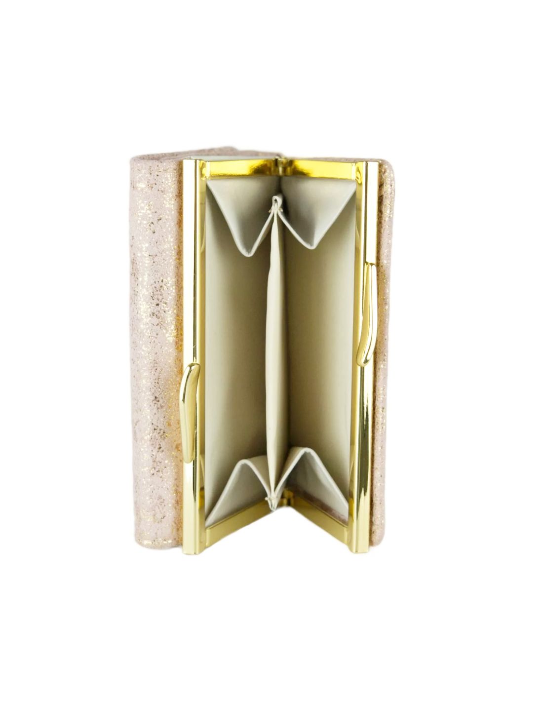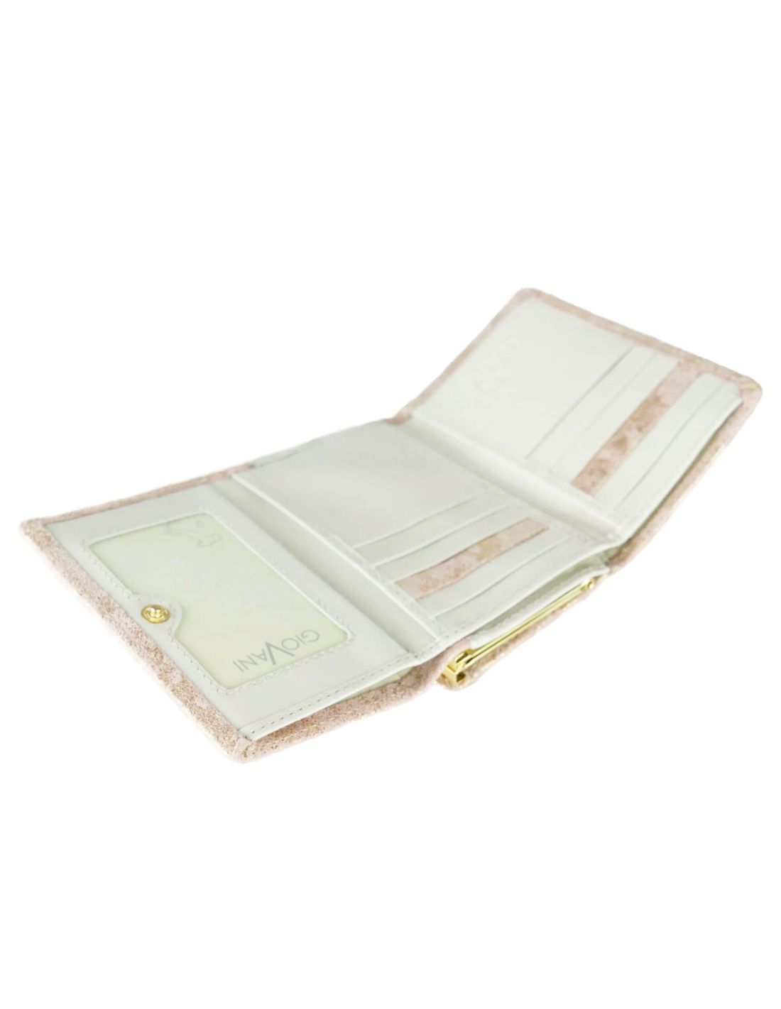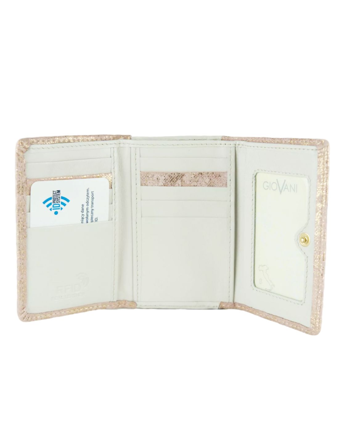 Portfel wykonany został z naturalnej skóry w przepięknych odcieniach złota i różu. Skóra, z której został uszyty, jest przyjemna w dotyku i pięknie się mieni. W zależności od tego, jak pada światło, raz bardziej wpada w róż, innym razem w złoto. Wygląda elegancko i ekskluzywnie. Dopełnieniem wyglądu portfela są złote detale takie jak: logo "GioVani", obszycie, czy bigiel służący do zamykania części przeznaczonej do przechowywania monet. Środek portfela wykonany został z beżowej, gładkiej skóry, która współgra z całością.