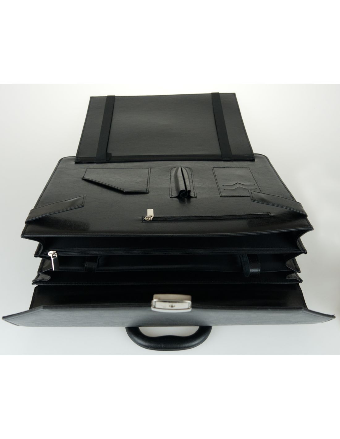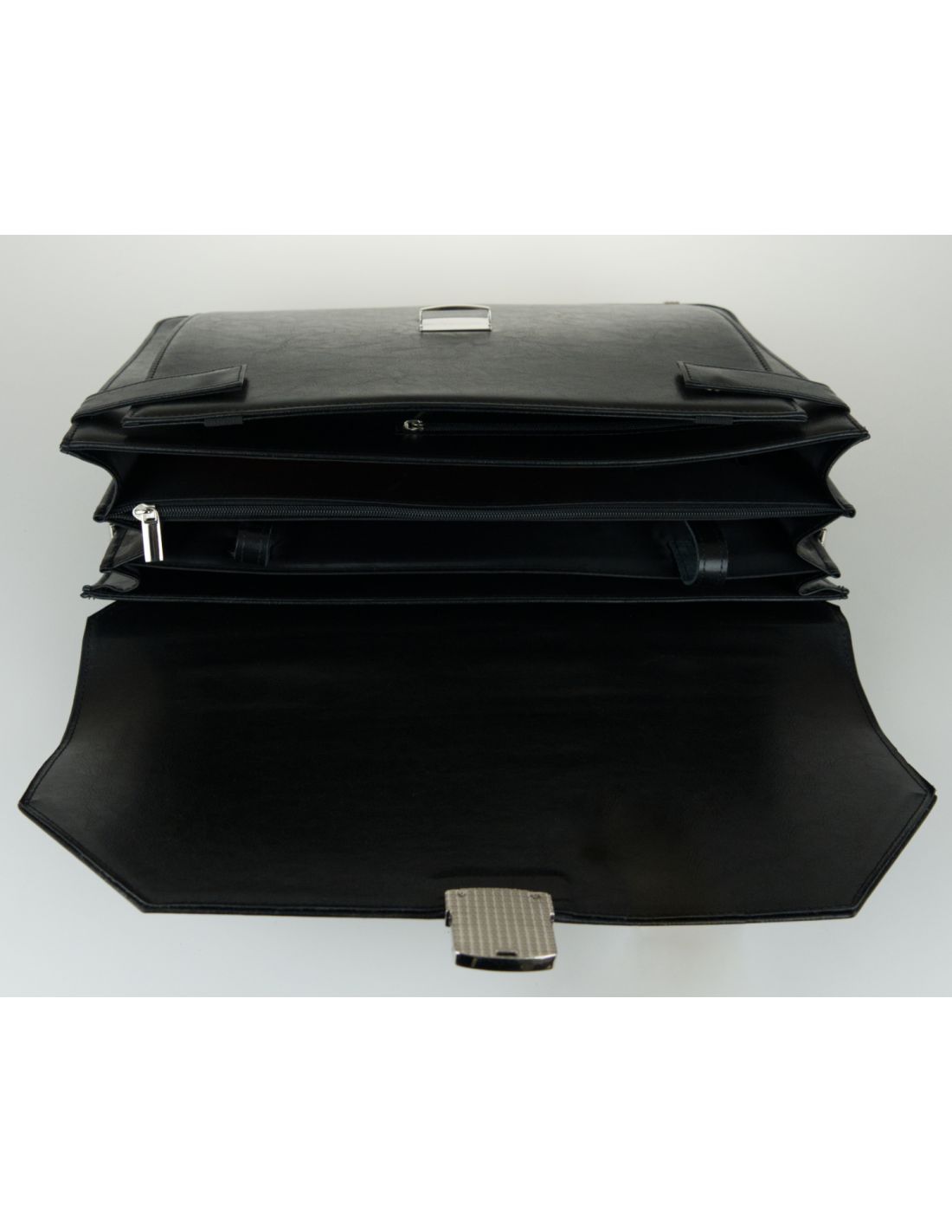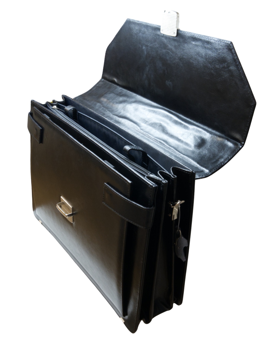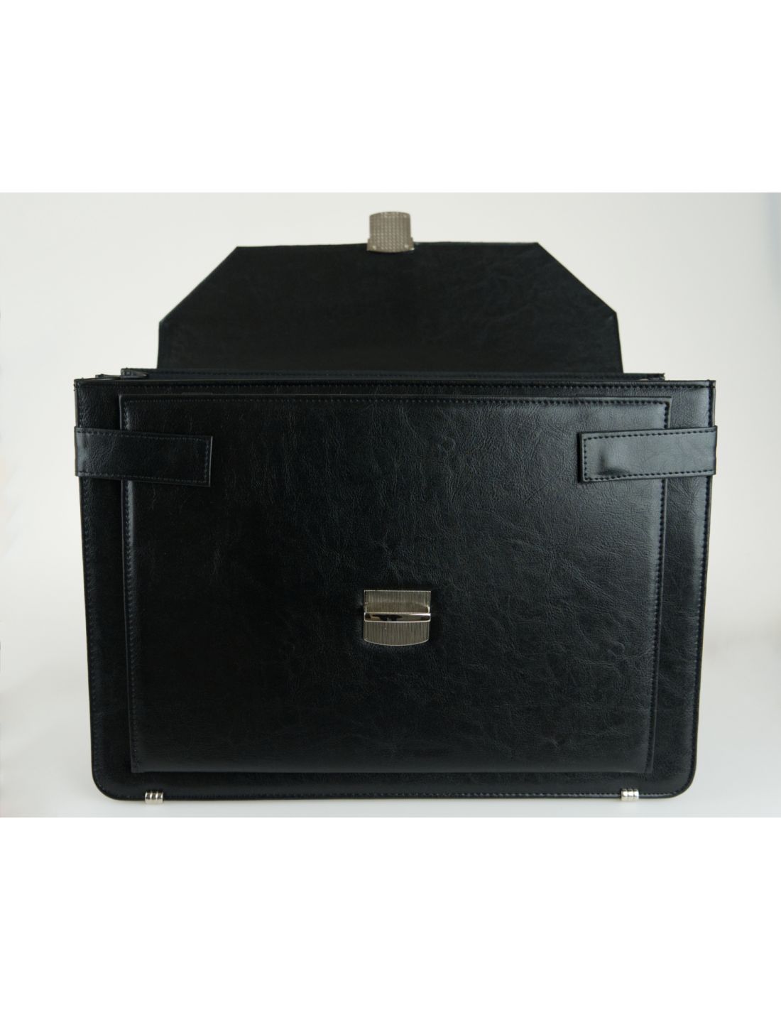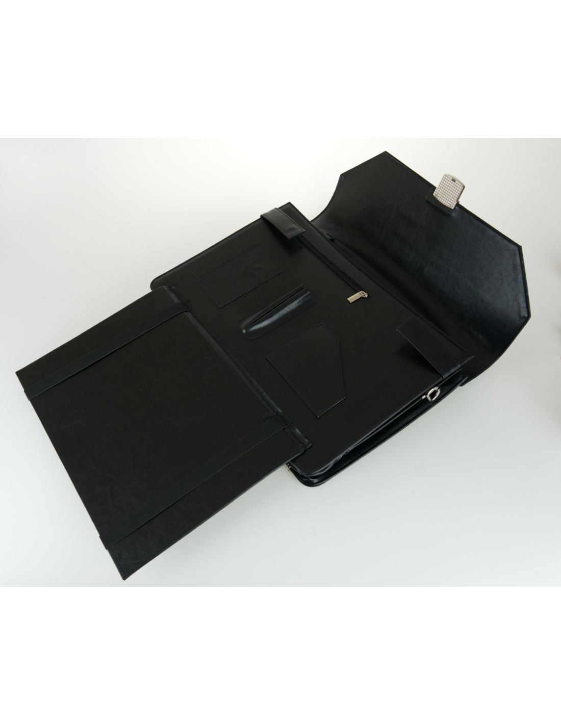 Teczka zamykana jest klapą z zapięciem na zatrzask z zabezpieczeniem na kluczyk.